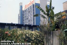 A recent 1965 batch of slides yielded this shot of the Disneyland Hotel. In an example of not-so-great planning, the sign had to read “Hotel Disneyland” because of the location of the elevator. Oops. This sign debuted in 1963 but was corrected in 1966 when the building was widened. The below March 1964 shot gives a nice panoramic view of the hotel from the parking lot:
