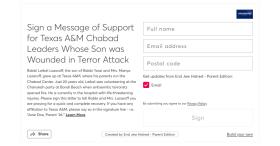 Support for Texas A&M Chabad Leaders Whose Son was Wounded in Terror Attack